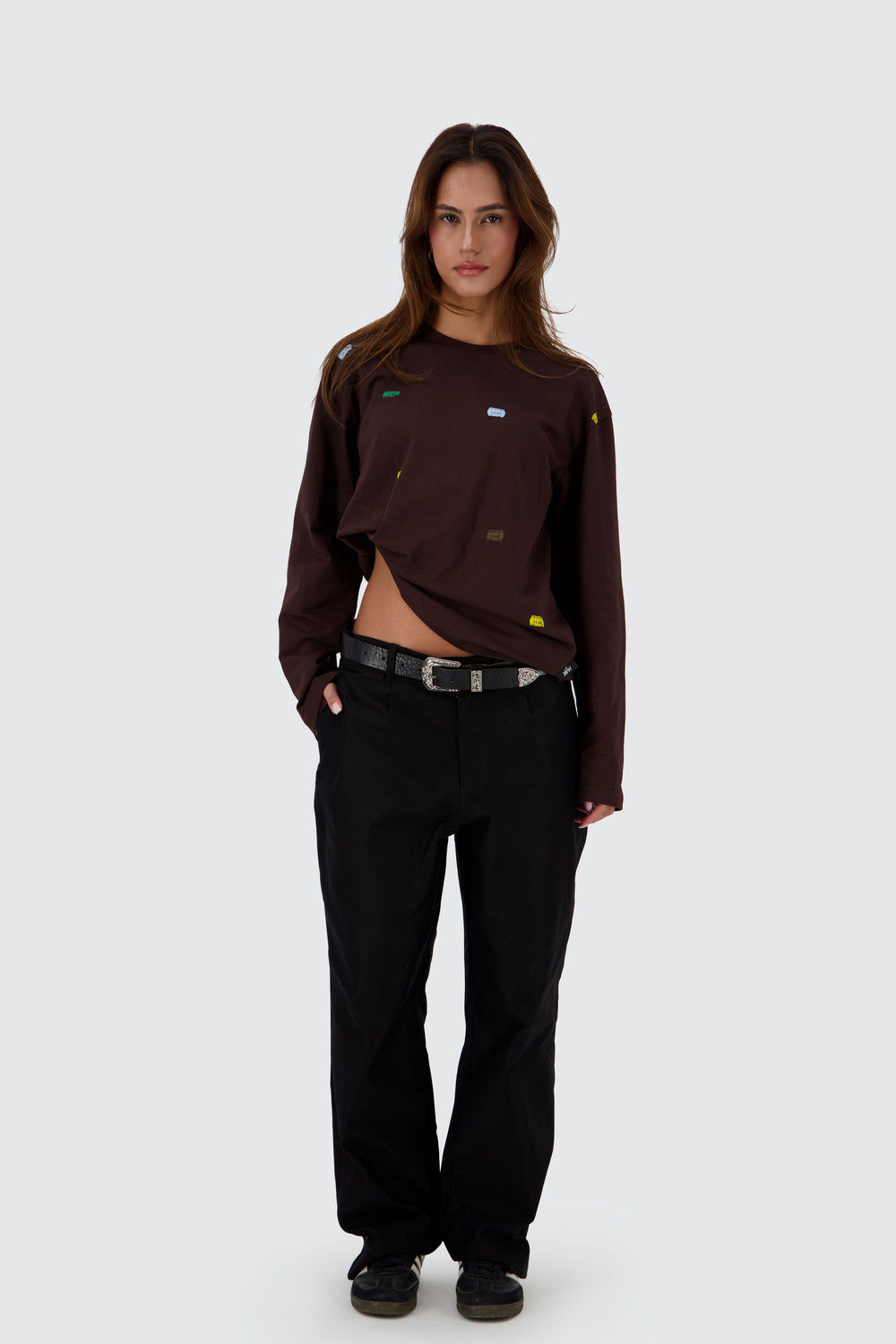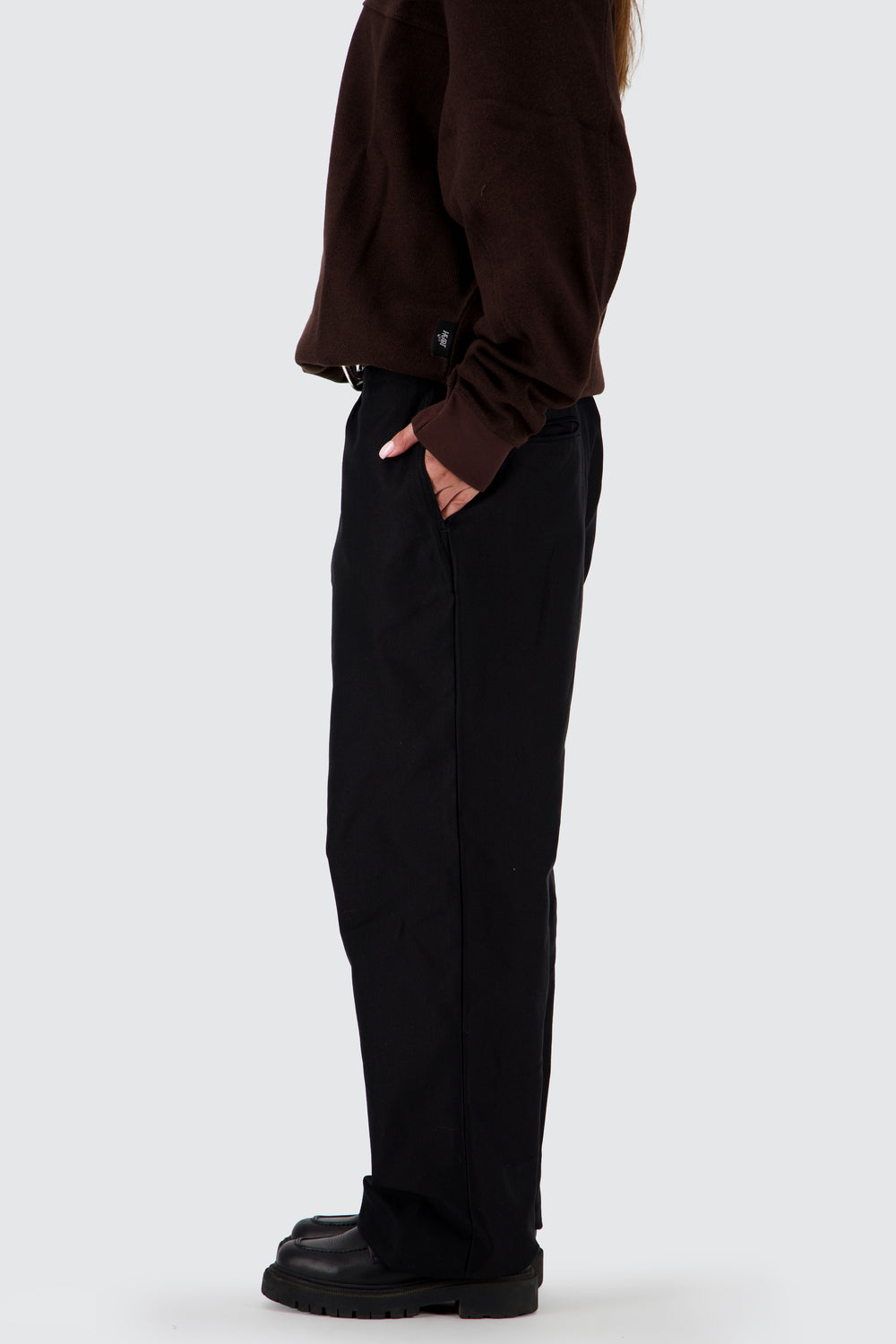 Unisex relaxed fit, wide leg chinos.